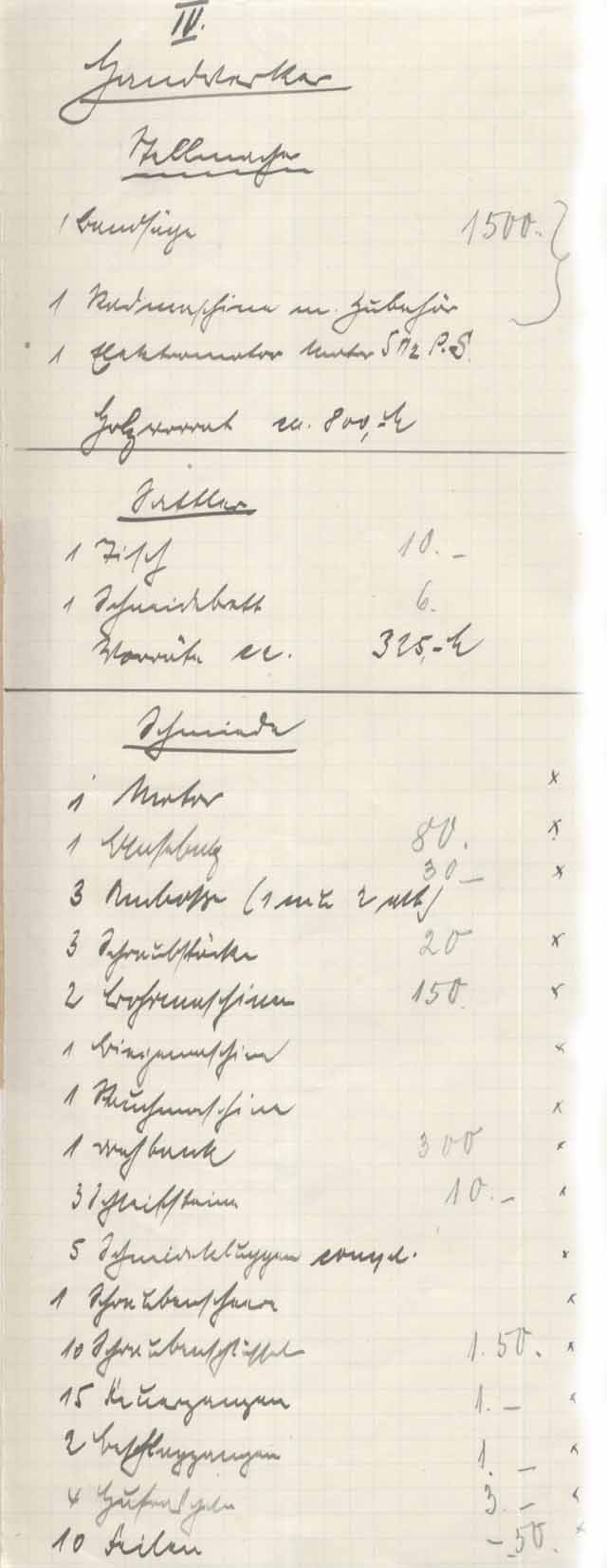 | h) Keller 3 Rübentragen (3,-), 2 Steintragen (6,-), 2 Schleifsteine (10,-), 1 Hobelbank (60,-), 1 Schrotsäge (6,-), 1 Handsäge (3,-), 1 Trennsäge (7,-), 2 Stemmeisen (1,-), 1 Zugmesser (3,-), 1 Handbeil (2,-), 1 Rauhbank ? (6,-), 2 Hobel (3,-), 1 Bohrwinde mit 2 Schlangenbohrern (3,-), 1 großen Schlangenbohrer (3,-), 1 Holzfeile (-,50) i) diverses Inventar 3 Kartoffelsiebe (15,-), 2 Abstakleitern (6,-), 2 längere Leitern (10,-), 1 große Straßenwalze, 12 Ortscheite, 11 Dreizüge, 12 Zweizüge, 2 alte Futterkasten (1,-) , 1 Hofuhr (5,-), 1 Regenmesser (6,-), 1 Mietenthermometer (3,-), 3 Hundehütten u. 3 Milchkannen (2,-), Bänke, 3 eiserne Bettstellen (12,-) für Schweizer nebst je 1 Strohsack (3,-), 1 Oberbett u. 2 Decken (60,-) mit Oberbettbezügen (15,-) und Kopfpolsterbezügen (kompl. 90,-) Für die Richtigkeit |