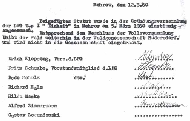 Am 5. März wurde in Mehrow die LPG Typ I "Einheit" gegründet. Gründungsmitglieder waren: Erich Klopsteg (Vorsitzender), Fritz Schaube, Bodo Schulz (beide Vorstand), Richard Malz, Hilda Manke, Alfred Zimmermann, Gustav Levandowski. ![]() |