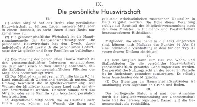 | Zum Unterschied zum Typ III (zu dem die 1954 gegründete LPG "Morgenrot" gehörte), bot der Typ I größere Freiheit bzgl. der privaten Wirtschaftsführung neben dem Genossenschaftsbetrieb. Die Bauern brachten zwar bis auf einen halben Hektar das gesamte Land in die LPG ein, behielten aber ihr Vieh und konnten damit privat wirtschaften. Für ganz "Widerspenstige" war das also eine Alternative ... |