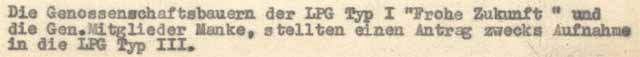 | Zweieinhalb Jahre nach der Gündung, im Herbst 1962, hatte die "Frohe Zukunft" aber schon wieder ihr Ende erreicht. Im Protokoll der Ratssitzung vom 18.10.62 ist nachzulesen, daß die Mitglieder dieser LPG die Aufnahme in die LPG Typ III beantragten: |