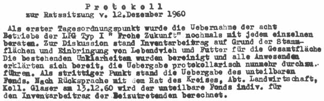 | Mit Datum vom 14.12.1960 findet sich dann das Protokoll einer zwei Tage zuvor stattgefundenen Gemeinderatssitzung, bei der es offenbar immer noch um Gründungsformalitäten der LPG "Frohe Zukunft" ging: |