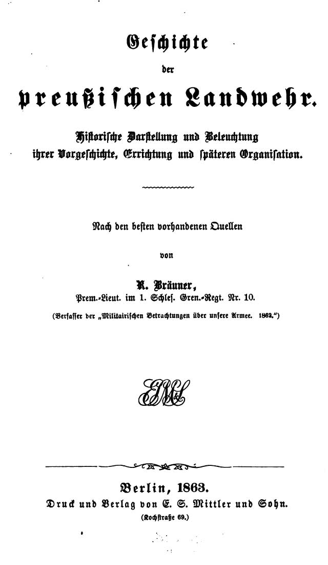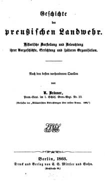 ... möchten wir darauf aufmerksam machen, ... daß die Idee der Landwehr eine längst vorhandene, bereits in verschiedenen Formen und Gestalten ins Leben getreten war; also von einem Urheber ... füglich überhaupt nicht die Rede sein kann. Es wird den großen Verdiensten des Generals von Scharnhorst wahrlich keinen Abbruch thun, wenn wir demgemäß behaupten, daß die Idee einer Volksbewaffnung zur Landesvertheidigung und Unterstützung des stehenden Heeres nicht erst in seinem Geist entstanden, sondern daß sie ... eine Wiederanknüpfung des zerrissenen historischen Fadens war. ...