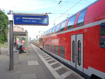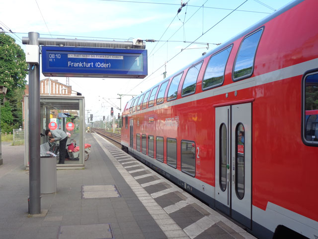 | Der Bahnhof Fangschleuse liegt wieder an der Bahnstrecke Berlin - Frankfurt (Oder) und wird von jedem RE 1 bedient, während an manchen anderen Stationen nur jeder zweite Zug hält. Grund dafür ist die nahe Tesla-Fabrik, die zwar noch im Entstehen ist, aber jetzt schon viele Beschäftigte hat, die zum großen Teil aus Berlin mit der Bahn anreisen. |