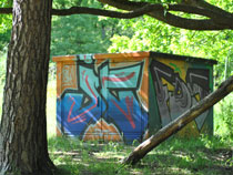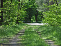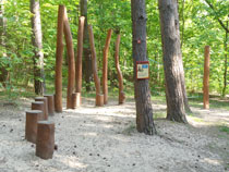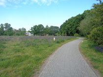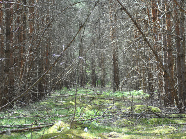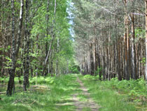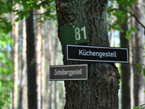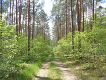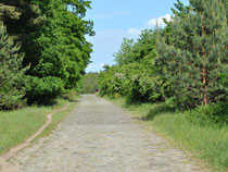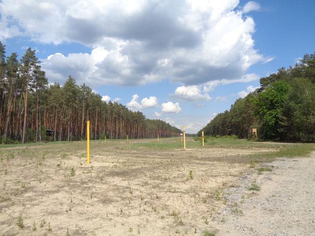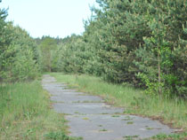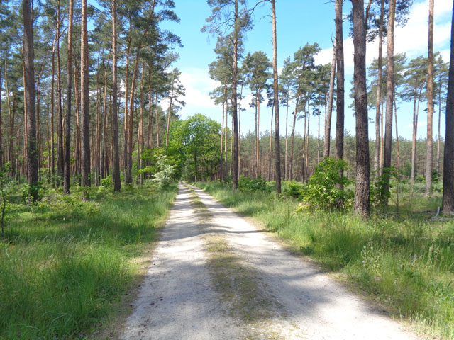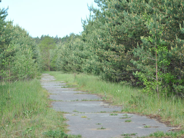 | Plattenwege zwischen jungen Schonungen deuten darauf hin, dass hier früher nicht nur der Förster durch den Wald spaziert ist. Bei OpenStreetmap, wo sich der Weg gut verfolgen lässt, erfährt man, dass es sich hier um ein ehemaliges Technik- und Raketenlager handelt. |