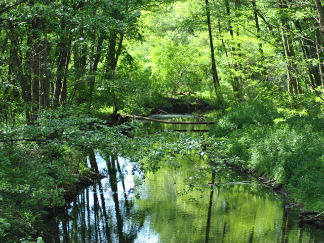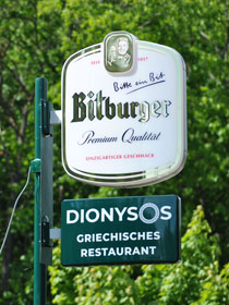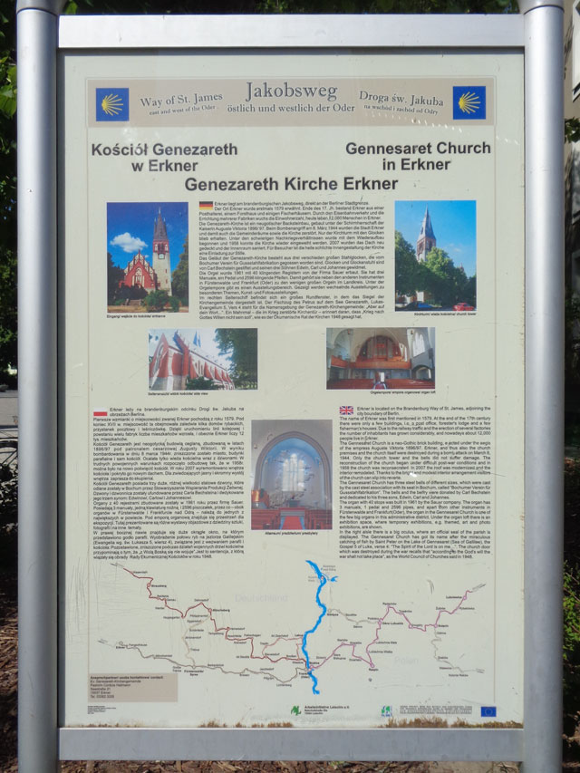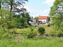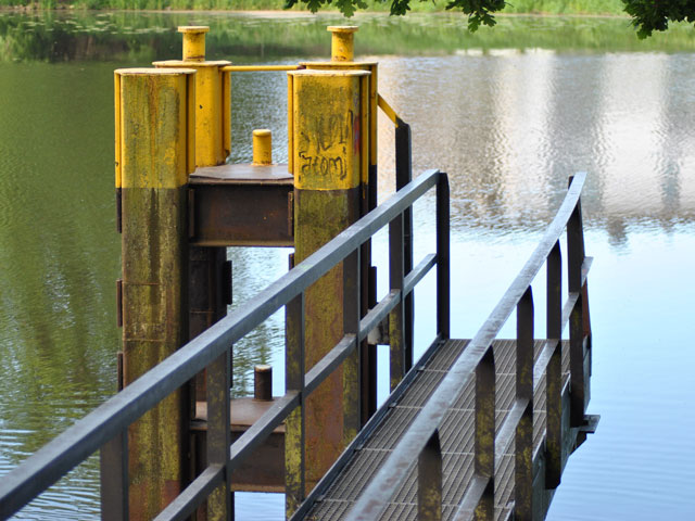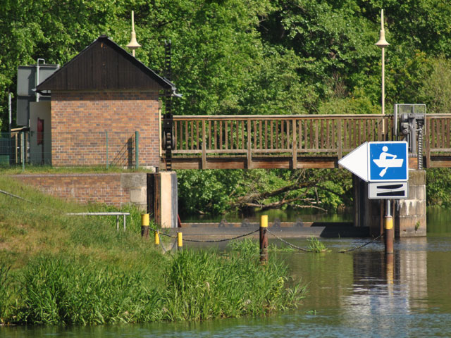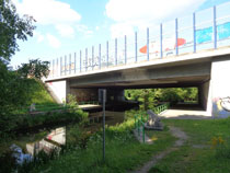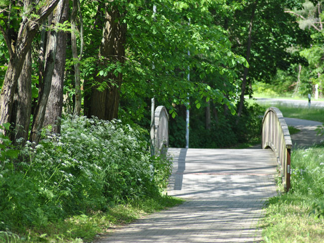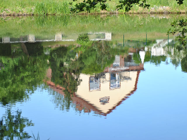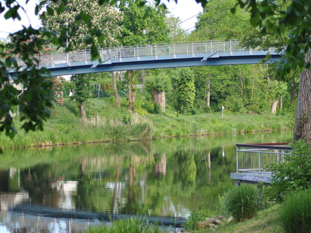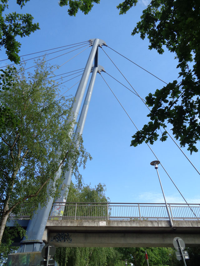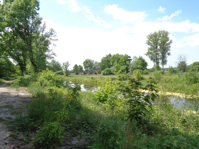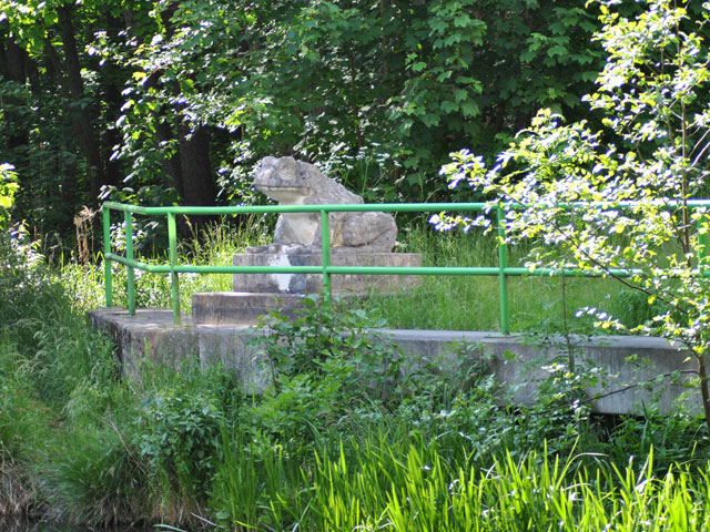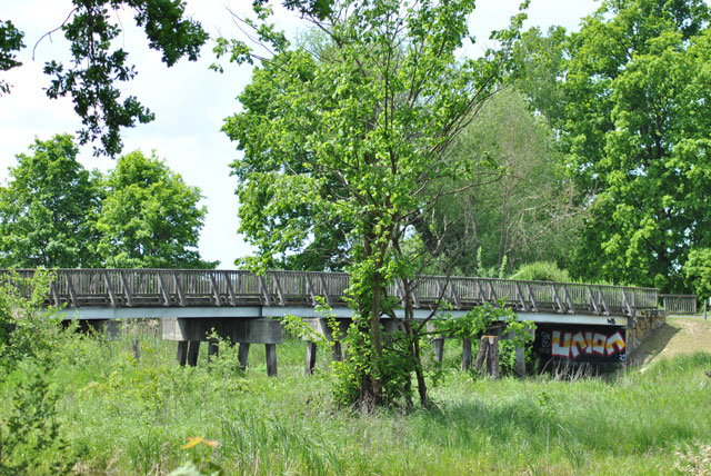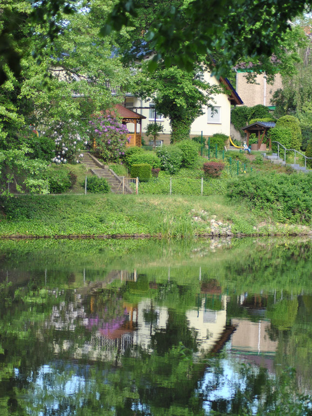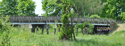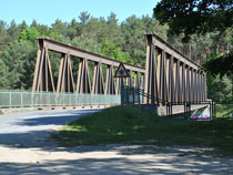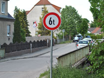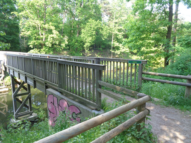 | Wenig später stehe ich an der Brücke, die nach Gottesbrück führt. Die links aus dem Nichts kommende Straße, die über die Brücke führt, heißt auch „Gottesbrück“. An der nächsten Gabelung wird ein Zweig der Straße zur „Ernst-Thälmann-Straße“. Wie fließend doch die Grenze zwischen Gläubigen und Nichtgläubigen sein kann!
