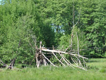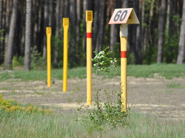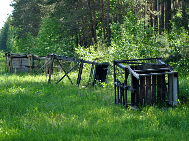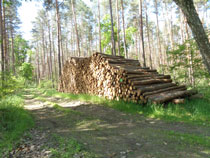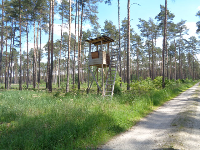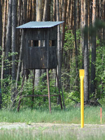 | Die Jäger haben in der Schneise unter der Freileitung ein gutes Schussfeld, und tatsächlich scheint sich hier die Jagd zu lohnen, denn sonst lägen kaum so viele neue Hochsitze zum Aufstellen bereit. Hoffentlich können hier ein paar der von Schweinepest befallenen Wildschweine auf dem Weg in unsere Gefilde aufgehalten werden. Der Zaun an der Grenze hat sich ja nicht als sehr wirkungsvoll erwiesen, zumal da laufend die Batterien geklaut werden. |