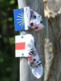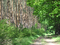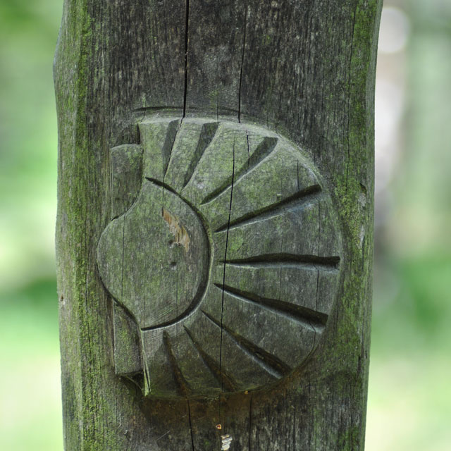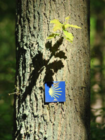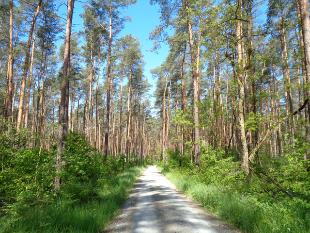 | Der Jakobsweg verläuft nun bis kurz vor Mönchwinkel schnurgerade durch den Wald. Radfahrer, Wanderer und erst recht Pilger sind hier nicht mehr auszumachen. | ![]() |