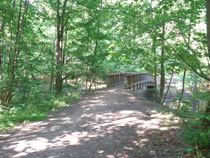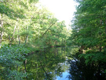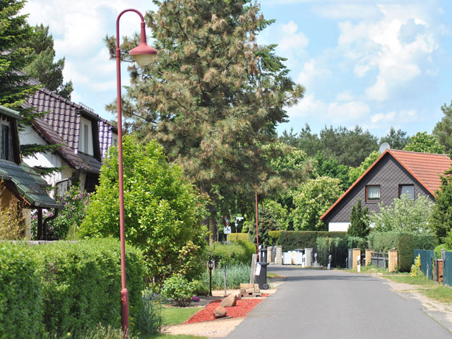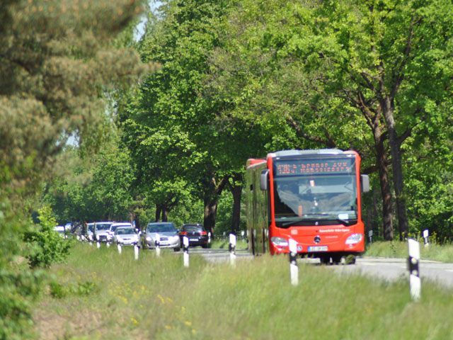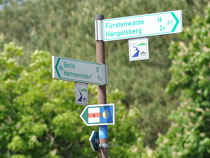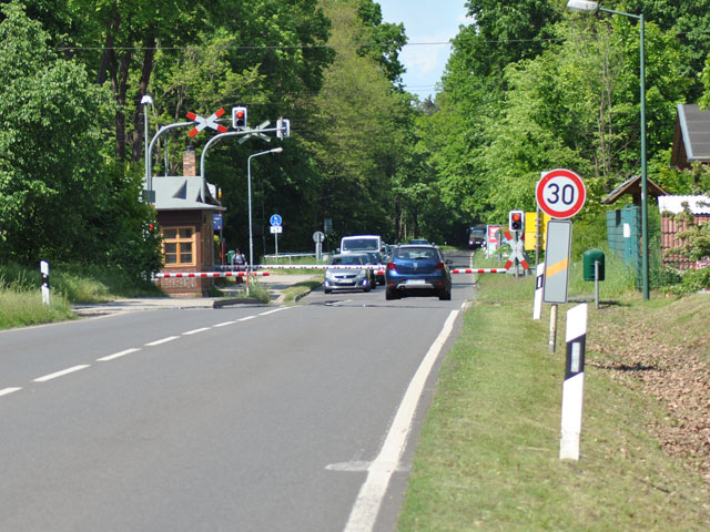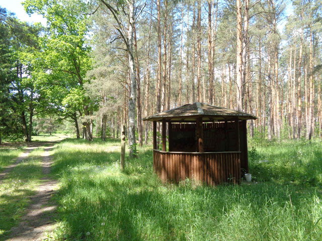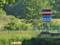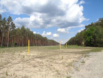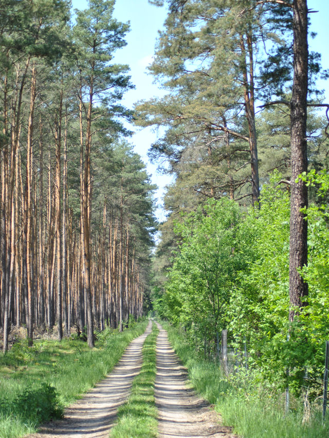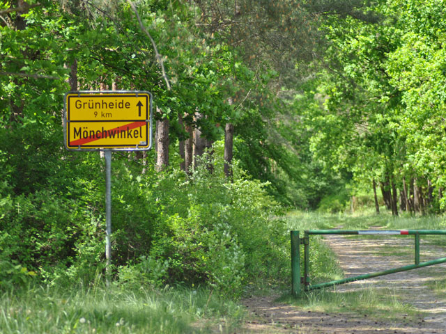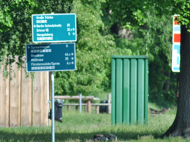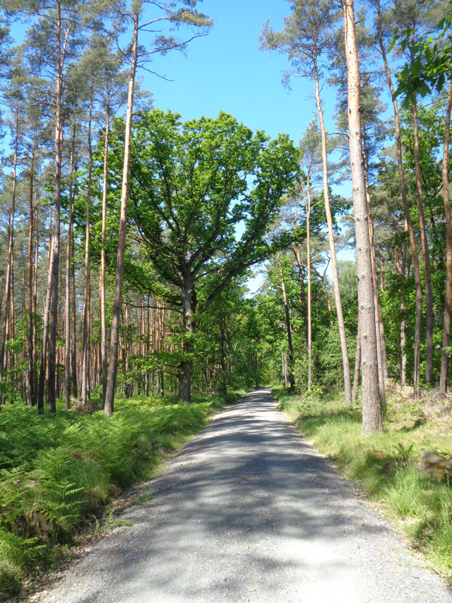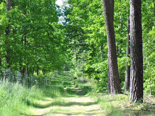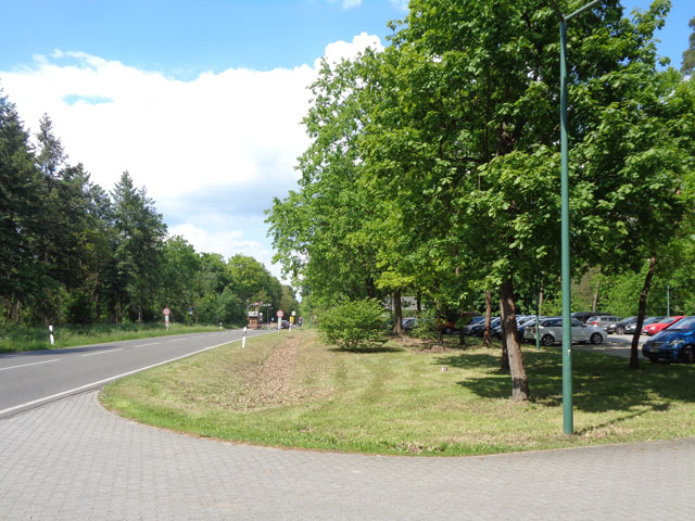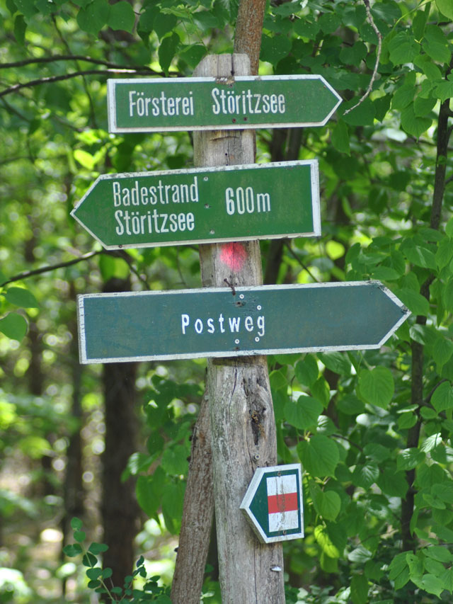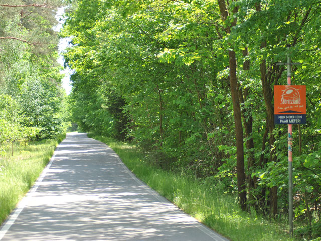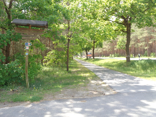 | Kurz bevor das Forsthaus Störitz und damit die (leider nicht sichtbare) Nordspitze des Sees erreicht ist, überquert der Weg die „Straße zum Störitzsee“, die zum „Störitzland“ führt. | ![]() |