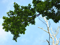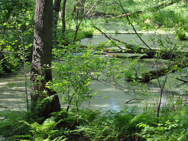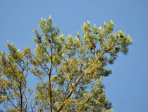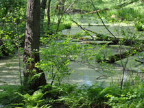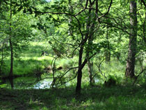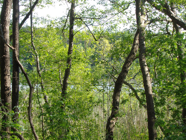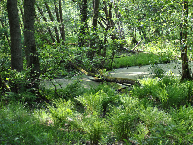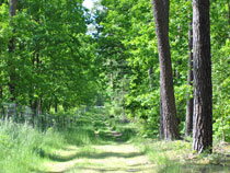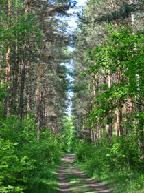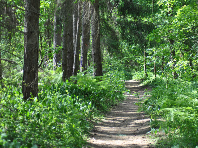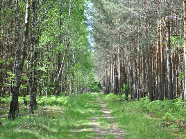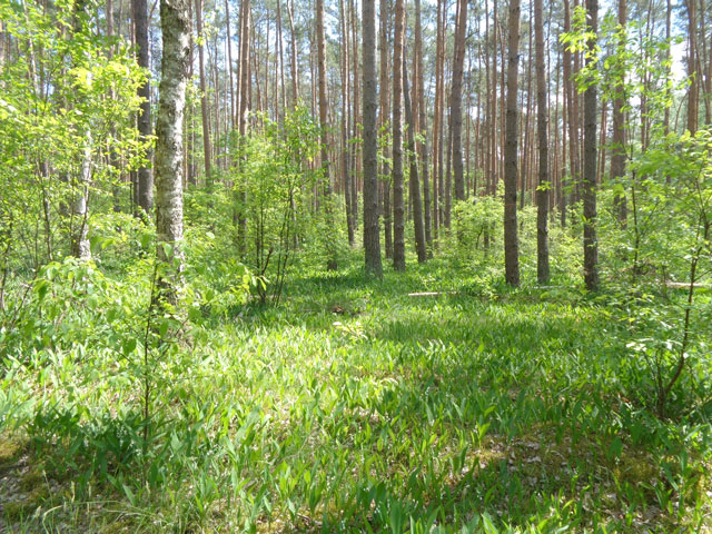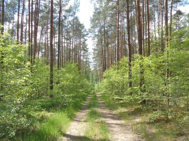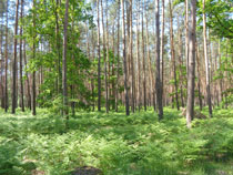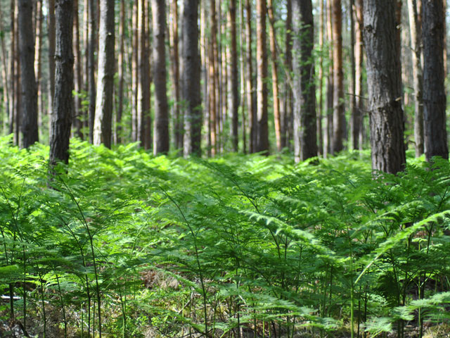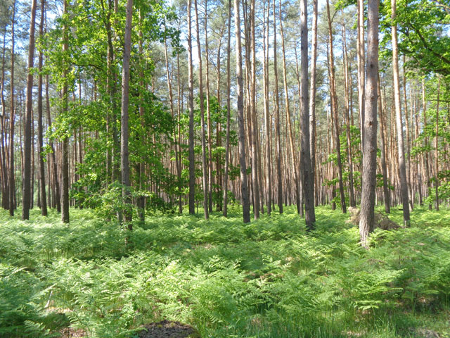Dann geht es wieder hinein in den Wald, dessen Boden oft dicht mit Farn bewachsen ist. Es ist ein Kiefernwald, aber überall versuchen Laubbäume, Platz zu finden. |