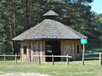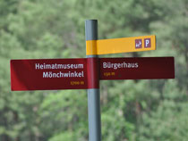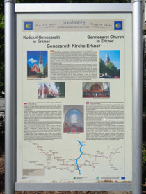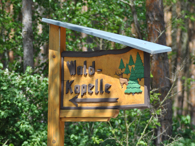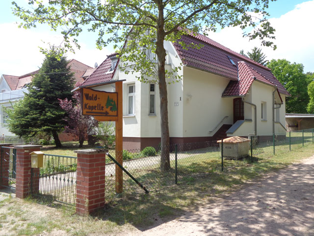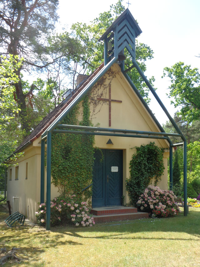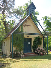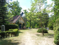 | Dem Jakobsweg folgend kommt man in der Neuen Spreeauer Straße vorbei am Bürgerhaus von Mönchwinkel, hinter dem sich der Dorffriedhof mit der Waldkapelle verbirgt. | ![]() |