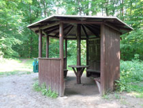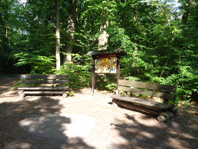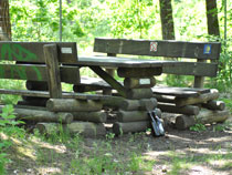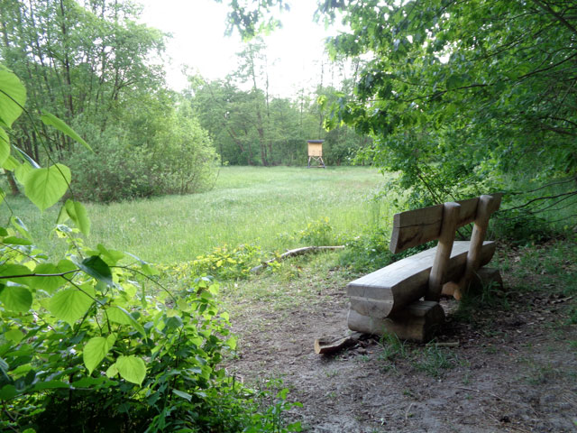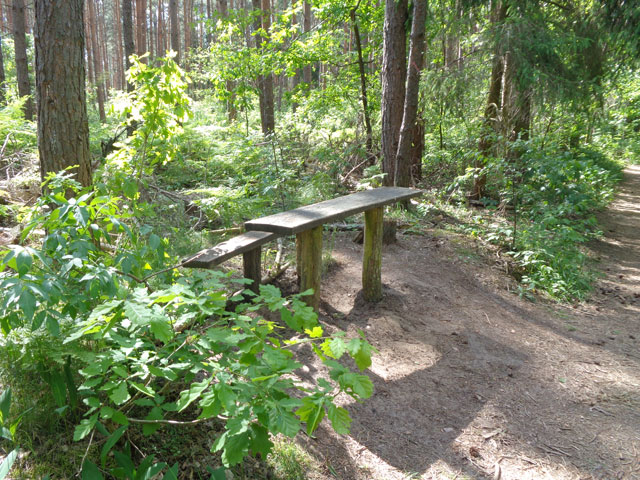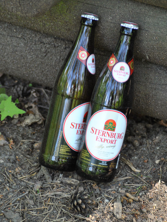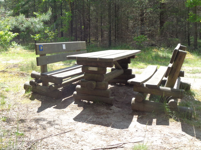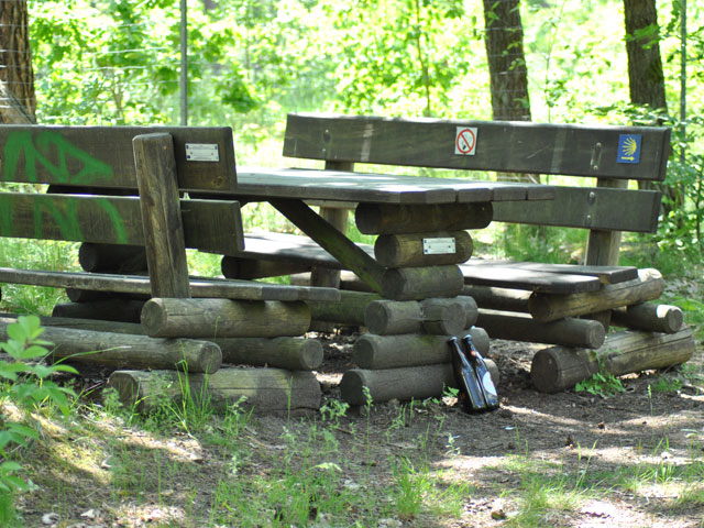 | Hinter der L 38 geht es wieder ein ganzes Stück geradeaus, bis man auf die nächste Sitzgruppe trifft. Hier lachen mich schon von weitem zwei Bierflaschen an. | ![]() |