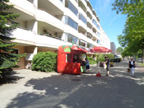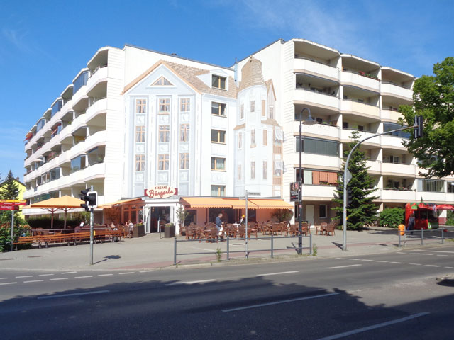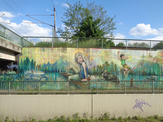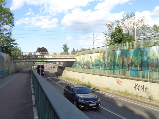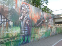 | Durch die Eisenbahnunterführung, die mit Impressionen aus Geschichte und Gegenwart der Stadt bemalt ist, kommt man auf der Fürstenwalder Straße zum Kreisverkehr an der Friedrichstraße. Hier wird gleich an zwei Personen erinnert, die in Erkner gelebt haben. |