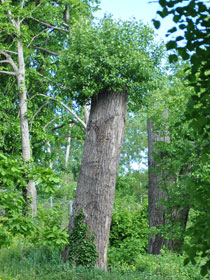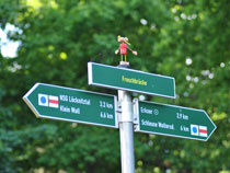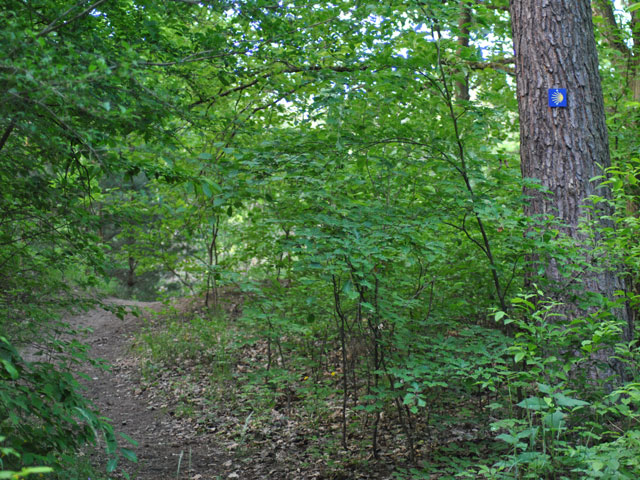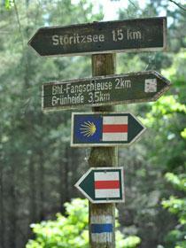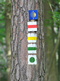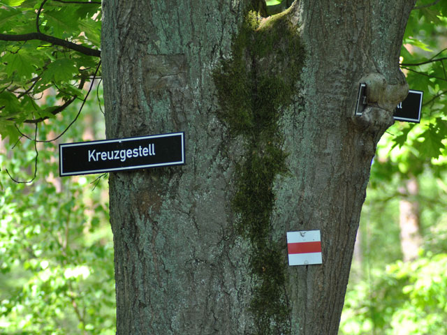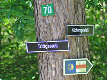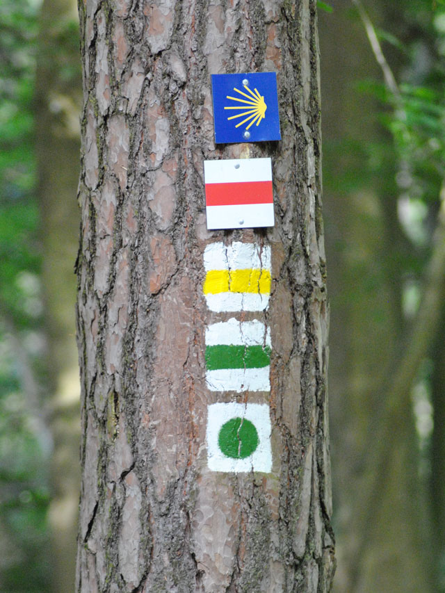 Wieder zurück auf dem richtigen Weg findet man fast alle denkbaren Wegmarkierungen an den Bäumen. |