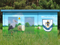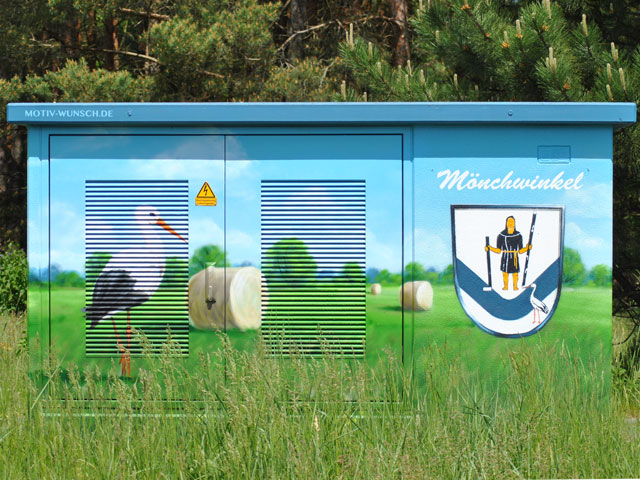 Nahe der Ortsfeuerwehr ist eine Trafostation sehr passend bemalt worden. Neben dem Bild mit einer Wiese, auf der ein Storch auf Futtersuche ist, sieht man das selbstredende Wappen des Ortes: Ein Mann mit Kutte und zwei Gerätschaften in der Hand, der an einem im rechten Winkel abknickenden Bach oder Fluss steht.