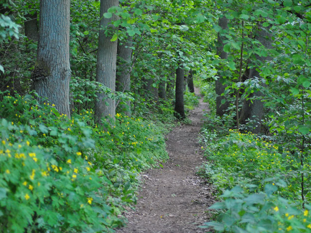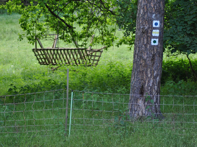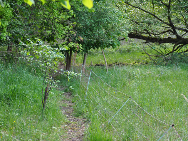 Der Weg führt jetzt mal ein Stück auf einem Trampelpfad an einer eingezäunten Wiese vorbei. Es kommen Zweifel auf, ob ich richtig bin, aber an den Bäumen hängen Wegmarkierungen ohne Ende. Ein paar Meter weiter links wäre vielleicht der „richtige falsche Weg“ gewesen, aber Wurst, bald ist der Weg wieder gut begehbar. |