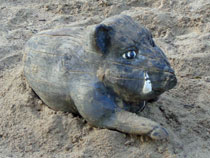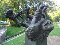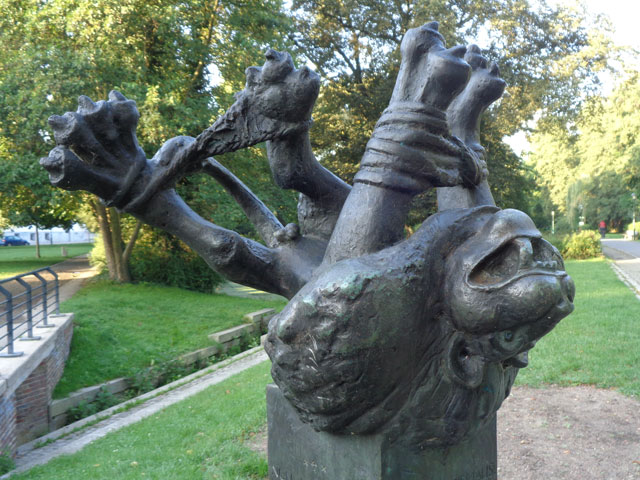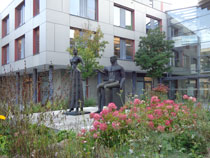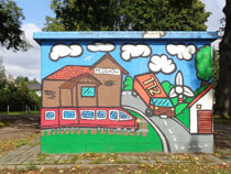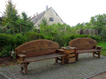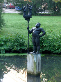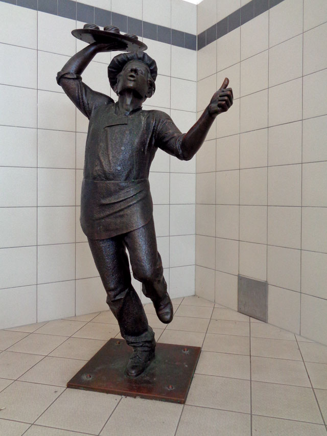 | In der Eberswalder Bahnhofshalle steht die Bronzefigur eines Bäckerburschen, der ein Tablett mit Spritzkuchen balanciert. | ![]() |