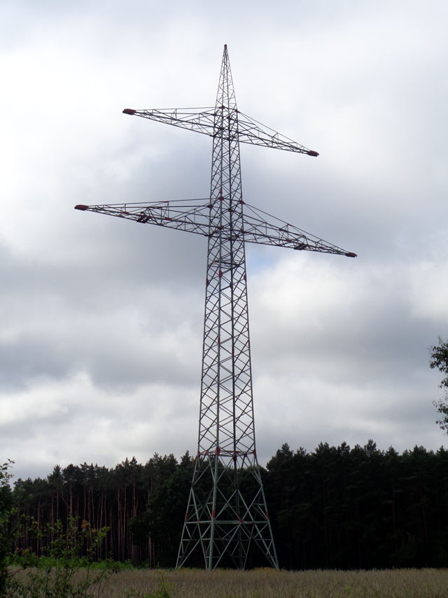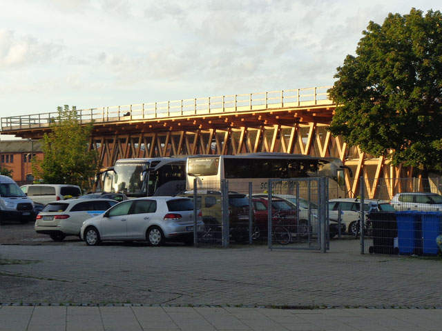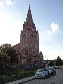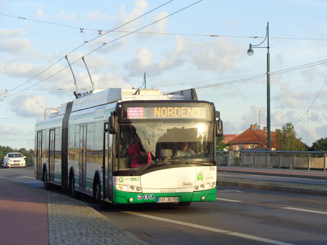 Neben dem Bahnhof entsteht gerade ein hölzernes Parkhaus - das Material ist ganz bewusst gewählt, denn Eberswalde mit seiner „Hochschule für nachhaltige Entwicklung“ (HNE) will die Verwendung nachwachsender Rohstoffe vorantreiben. Und die wohl bekannteste Attraktion der Stadt werde ich gleich für die Fahrt zum Marktplatz benutzen: den O-Bus. Es gibt in Deutschland nur noch drei Städte, in denen ein solcher „Strippenbus“ verkehrt: Esslingen, Solingen und Eberswalde. Hier verkehrt der O-Bus seit 1940, das Streckennetz besteht aus zwei Linien, ist ca. 37 km lang und wird seit 2010 von „Trollino“-Bussen des polnischen Unternehmens Solaris bedient. |