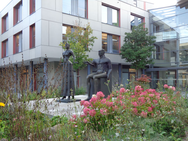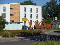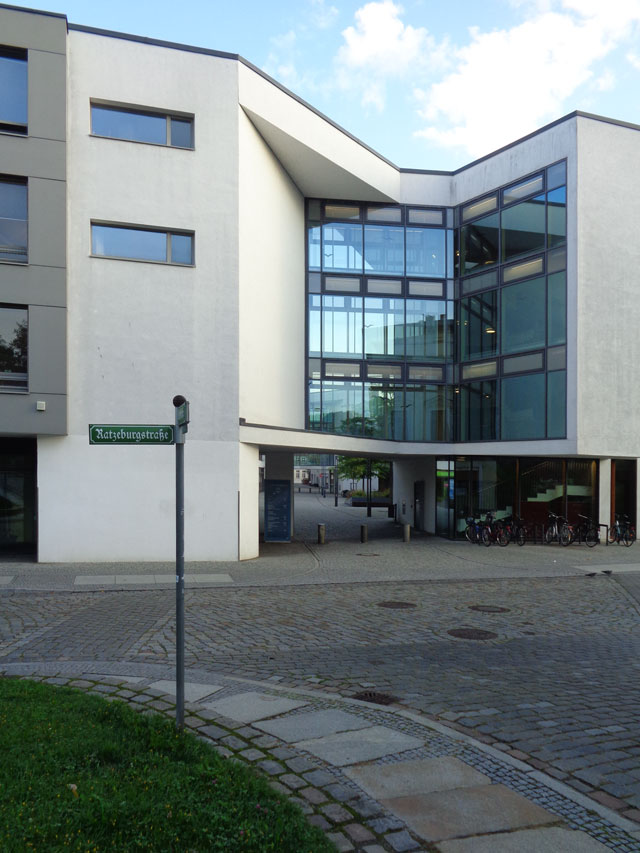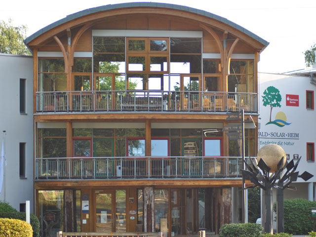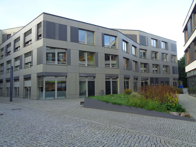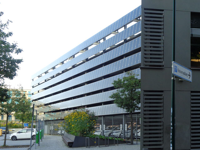 | Und man sieht in der Stadt viele Beispiele für gelungenen Umweltschutz und nachhaltiges Bauen. Beim Parkhaus der Kreisverwaltung an der Ecke Pfeilstraße / Goethestraße ist beispielsweise die nach Süden gerichtete Fassade mit Sonnenkollektoren bestückt; und zwar so, dass sie nicht stören, sondern eher ein Fassadenschmuck sind. |