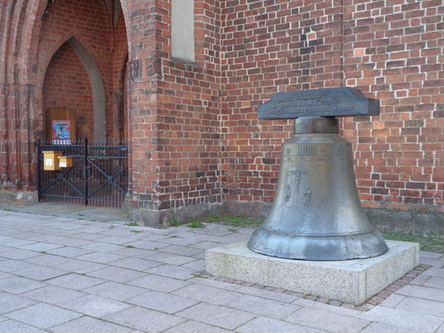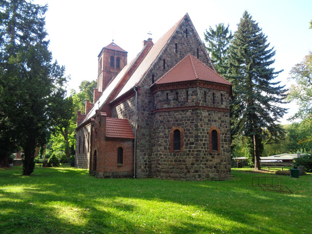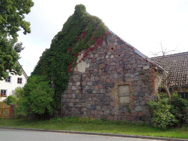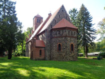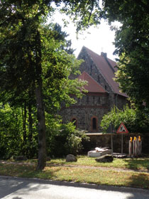 Noch ein paar Meter weiter steht hinter einer hohen Mauer und dicht belaubten Bäumen verborgen die Ladeburger Dorfkirche, ein Feldsteinquaderbau aus dem 13. Jahrhundert. |