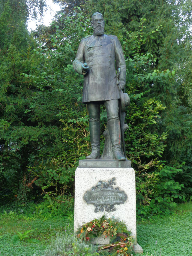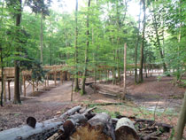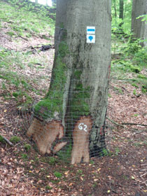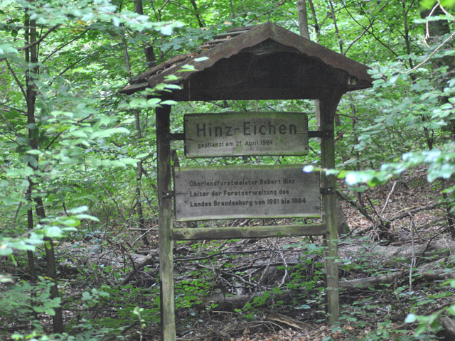 | Rings um Eberswalde darf man sich nicht wundern, wenn man laufend auf Erinnerungsorte für verdienstvolle Forstbeamte trifft. Hier sind es zunächst die „Hinz-Eichen“, die im April 1994 zu Ehren des Oberlandforstmeisters Robert Hinz gepflanzt wurden, der 1991-1994 Leiter der Forstverwaltung des Landes Brandenburg war.