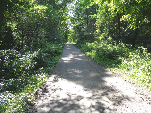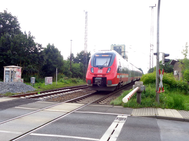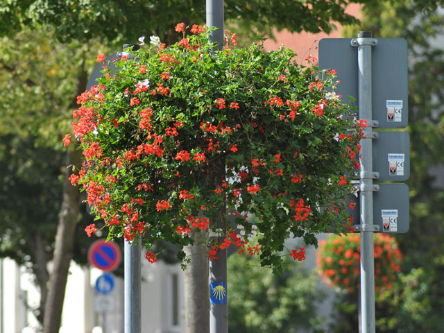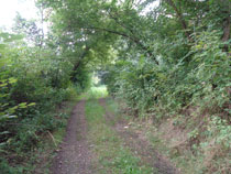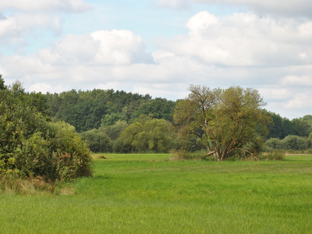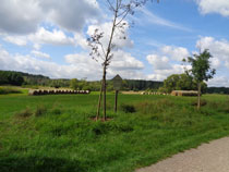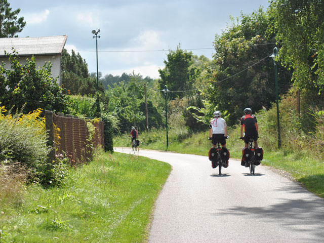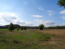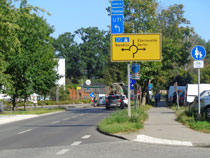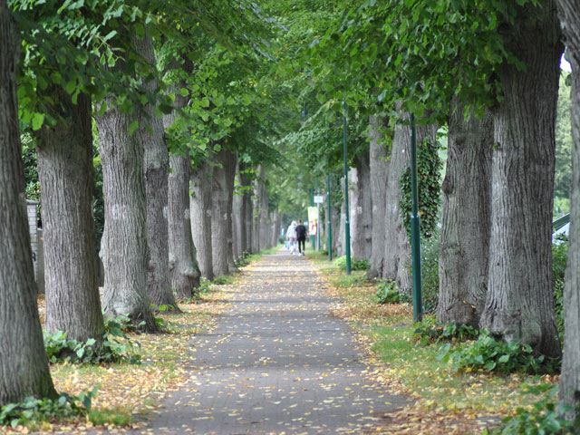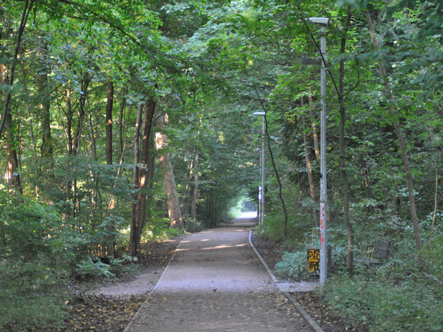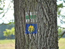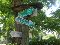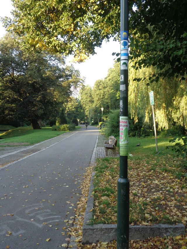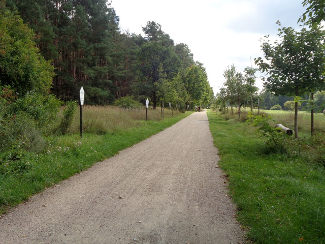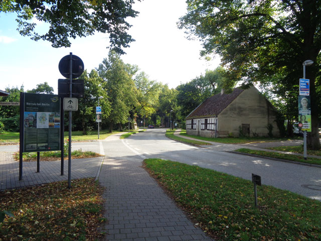 | Der ausgeschilderte Jakobsweg zweigt noch in Ladeburg von der Bernauer Straße ab und verläuft schnurgerade entlang der Zepernicker Landstraße, die teils von Wohnsiedlungen, teils von Feldern begrenzt wird und irgendwann ihren Namen in „Kirschgarten“ wechselt.