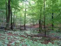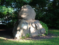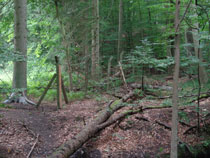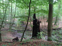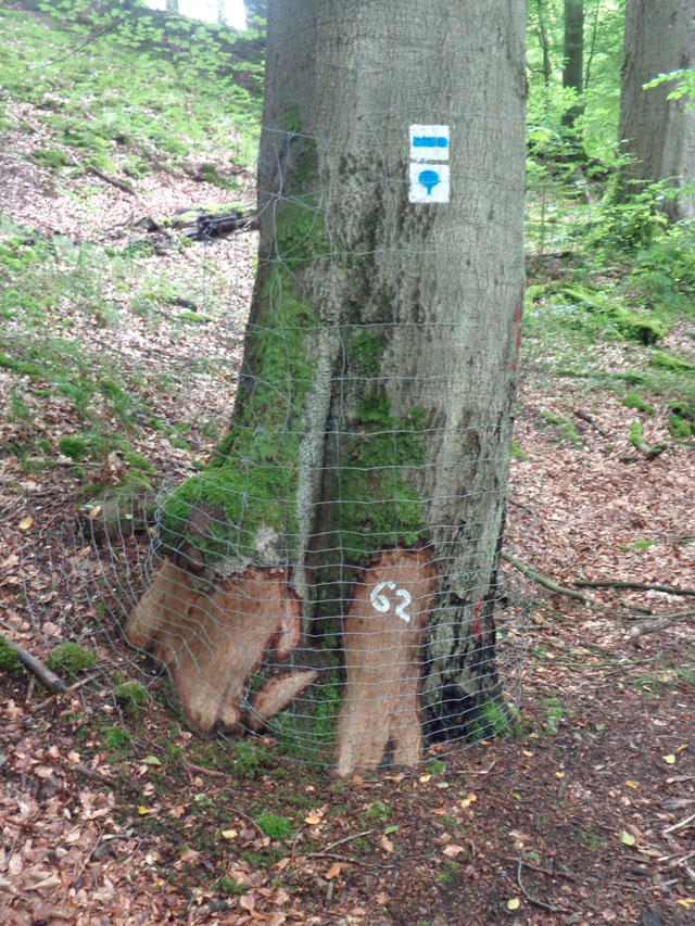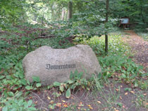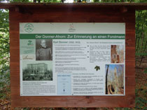 Ein Stück weiter weckt ein großer Feldstein mit der Inschrift „Donnerahorn“ das Interesse des Wanderers. Eine nahe Infotafel klärt auf, dass hier ein riesiger Bergahorn stand, der 1913 nach dem Oberlandforstmeister Karl Donner benannt wurde, welcher von 1885 bis 1901 Leiter der preußischen Staatsforstverwaltung war. 2008 ist der Baum gebrochen und bis auf den Baumstumpf abgetragen worden. Eine 1999 vorgenommene Vermessung hatte eine Höhe von 27,5 m und einen Umfang von etwa 3,4 m erbracht. |