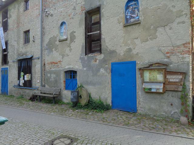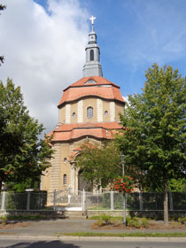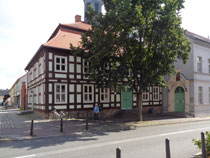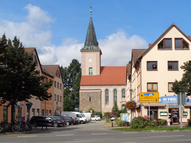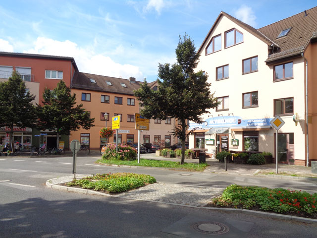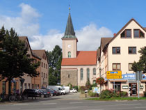 | In den Straßen rings um den Markt findet man ein paar Gaststätten und Geschäfte. Die nach rechts abgehende Kirchgasse führt zur etwas erhöht gelegenen evangelischen Stadtkirche, die im 13. Jahrhundert errichtet und nach einem Stadtbrand, der nur den Turm übrig gelassen hat, 1762-66 neu gebaut wurde. |