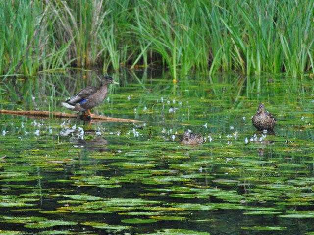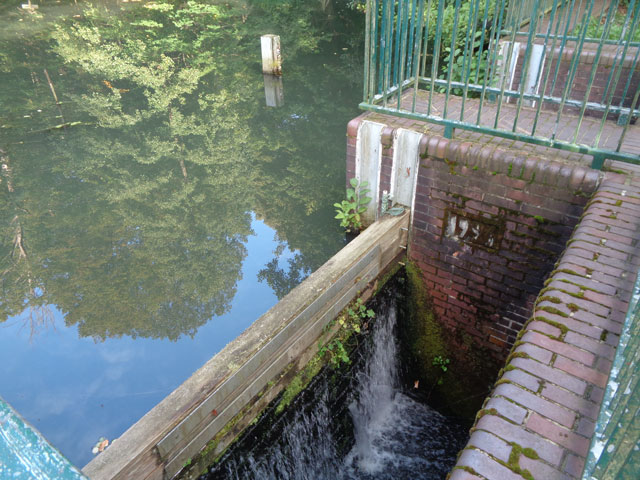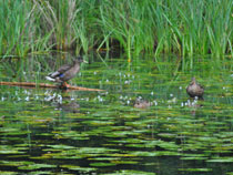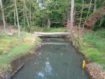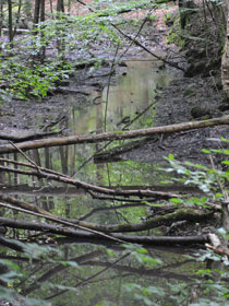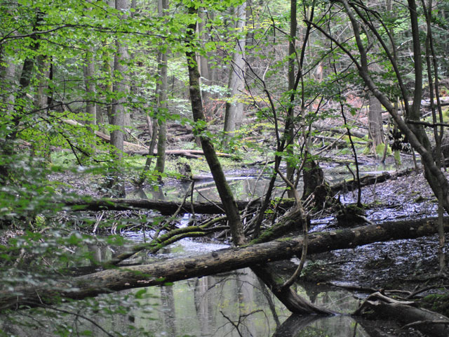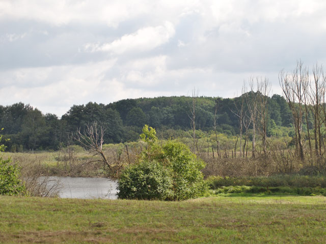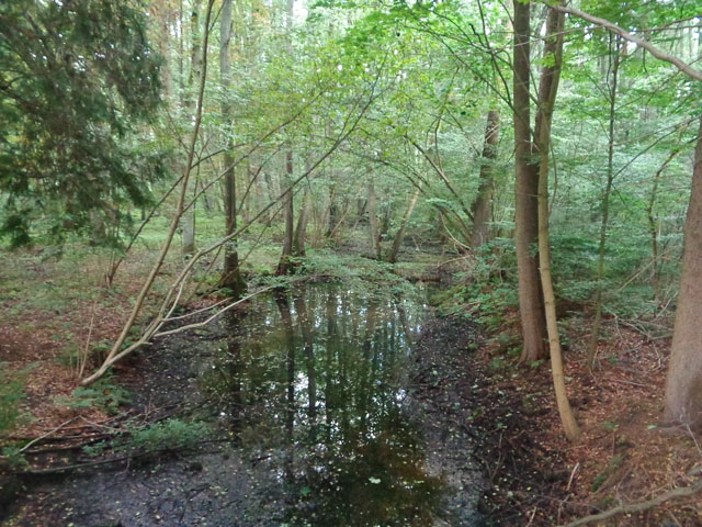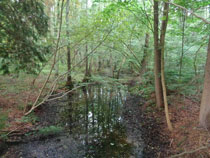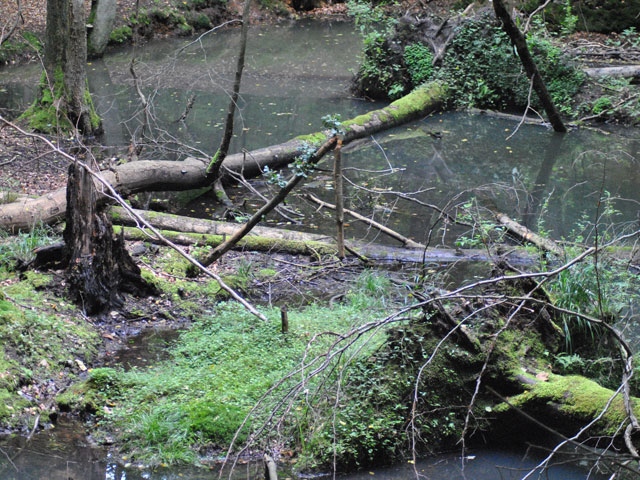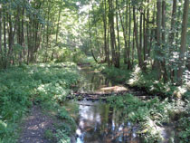 | Der anfangs gepflasterte Weg überquert nach etwa 500 m das Nonnenfließ und verläuft fortan auf dessen Ostseite entgegen der Fließrichtung. Nahe der Brücke kann man kleine Moore entdecken, die sich durch herausragende abgestorbene Bäume verraten. |