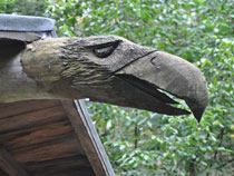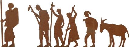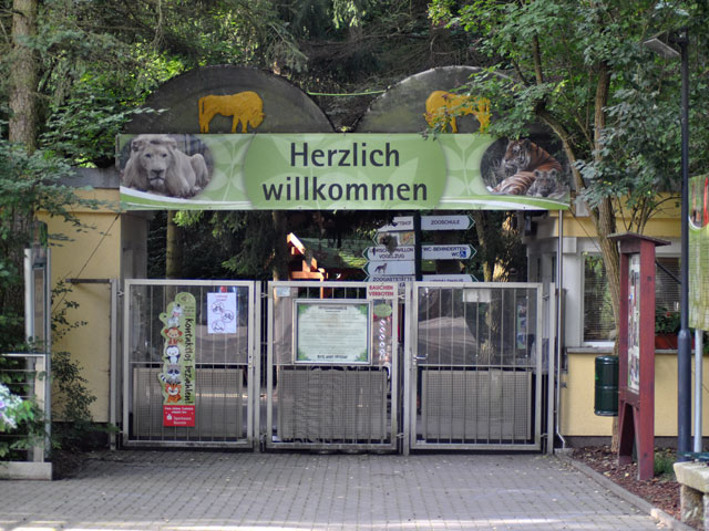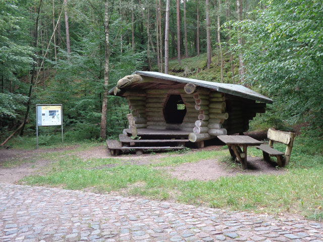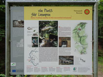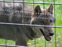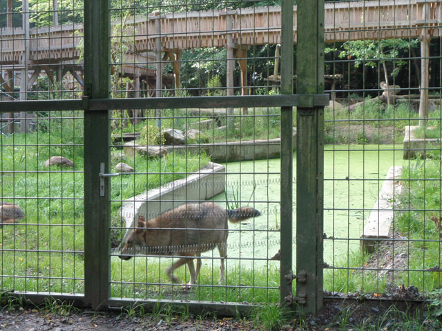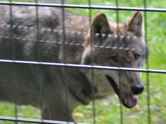 | Gleich hinter der Mühle biegt der Jakobsweg links ab in den Wald. Ein Stück weiter steht man plötzlich vor einem Wolfsgehege, in dem ein Isegrim als Torwächter auf und ab läuft. Durch das Gehege verläuft in etwa 2 Meter Höhe ein Laufsteg. Vermutlich soll da oben der Schäfer vor Wölfen geschützt seine Herde sicher zur nächsten Weide treiben. Schließlich muss ja irgendwo der Begriff „Schäfersteig“ herkommen. |