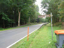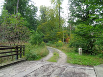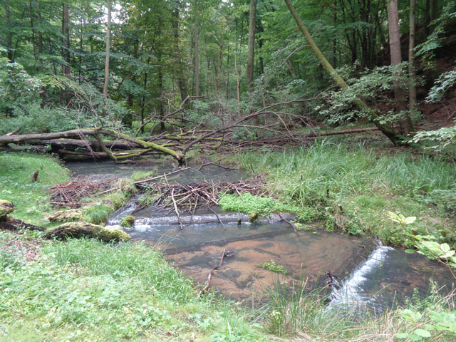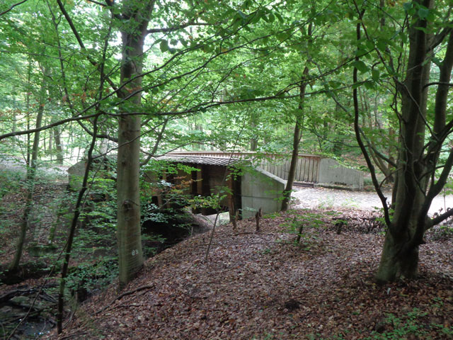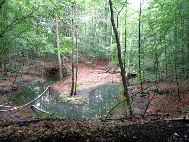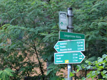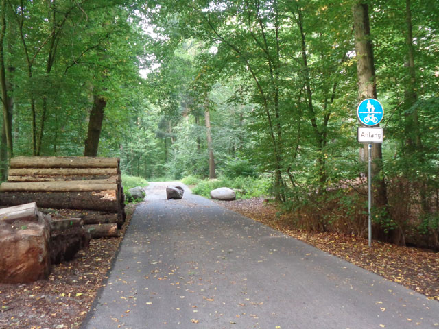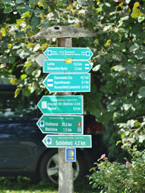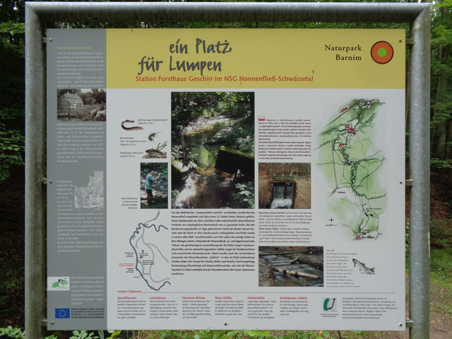 | Hinter dem Waldhof läuft es sich etwas ungemütlich, weil es keinen ordentlichen Fußweg gibt. Aber schon bald kommt der Wegweiser „Nonnenfließ 300 m“, der in den Wald zeigt. | ![]() |