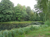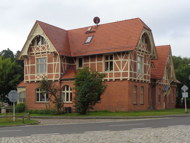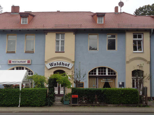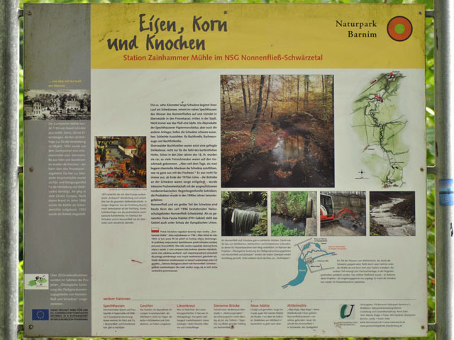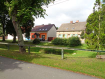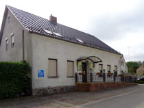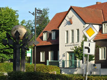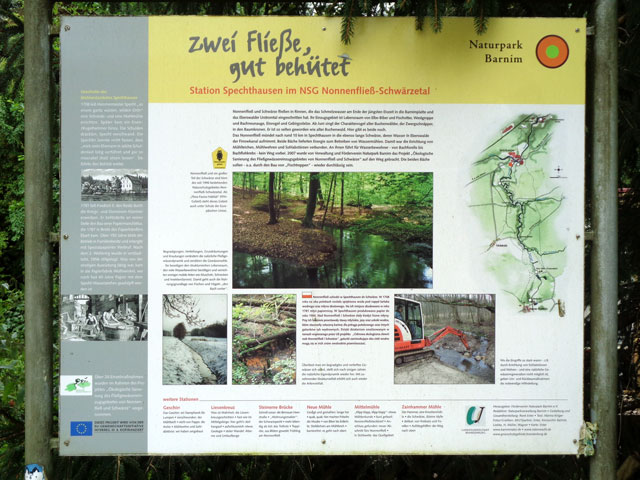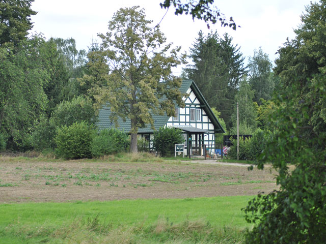 | Der Weg führt weiter durch den Ort in Richtung Melchow, über einen von der Schwärze gebildeten, langgestreckten Teich hinweg und vorbei an der Gaststätte Waldhof, in deren Gebäude sich auch die Heimatstube Spechthausen befindet. |