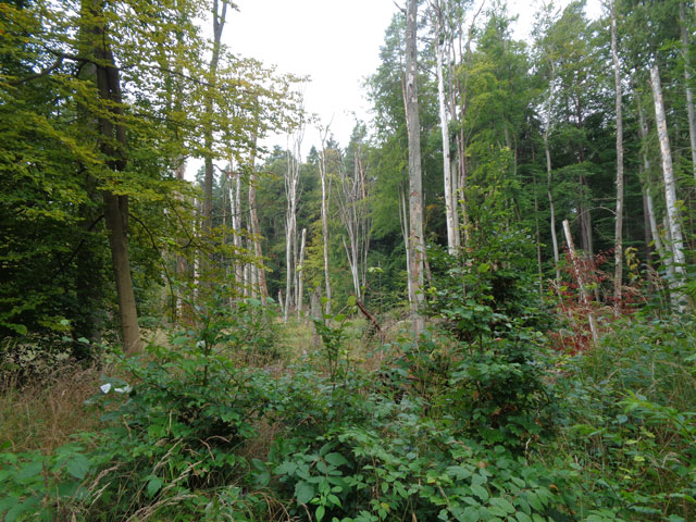 Die Baustellengeräusche sind bald verklungen und man läuft in fast bedrückender Stille lange durch den Wald, in dem es momentan an Pilzen wimmelt. |