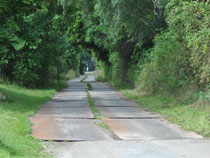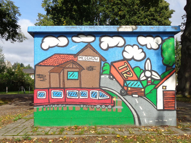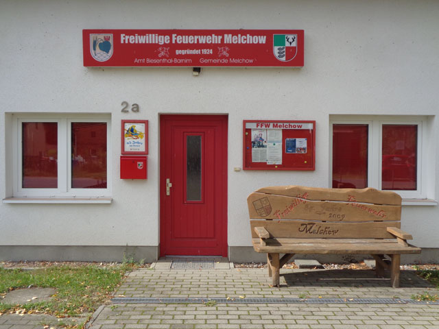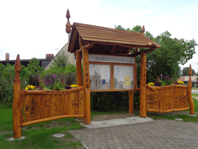 | Die verlängerte Dorfstraße ist in Richtung Melchow derzeit mit großen Eisenplatten belegt, was darauf hindeutet, dass hier Baumaßnahmen stattfinden. | ![]() |