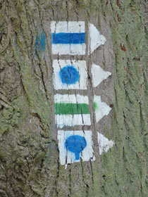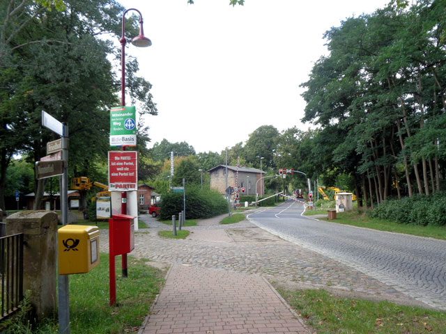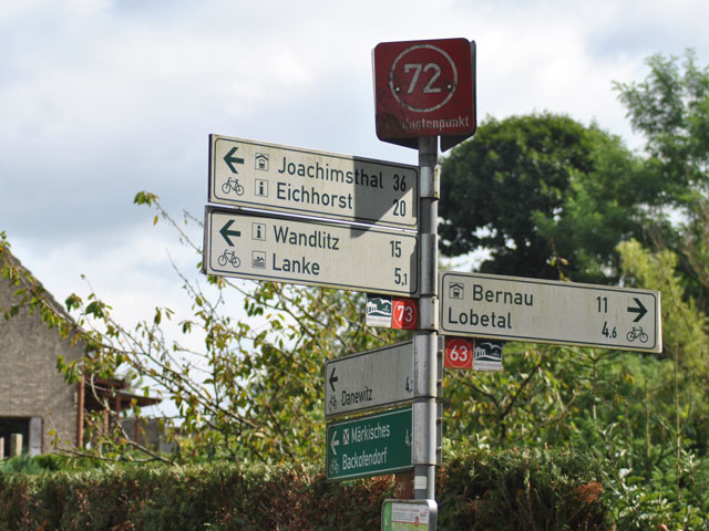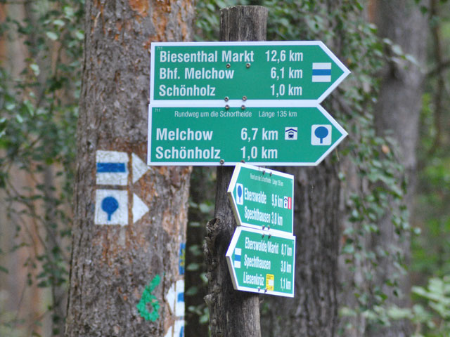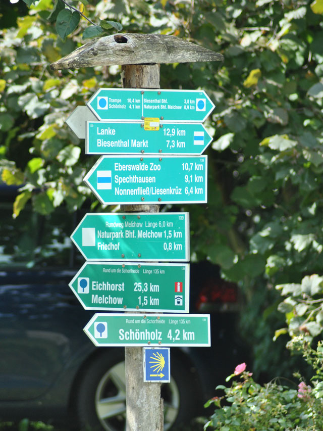 Im Ort zweigt der Wanderweg „Rund um die Schorfheide“ ab. Der Jakobsweg führt wie der Weg mit dem blauen Strich weiter auf der Dorfstraße in Richtung Biesenthal. |