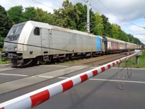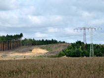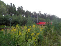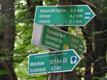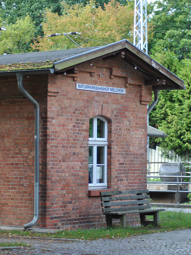 | Hinter dem Bahnübergang am „Naturparkbahnhof Melchow“ biegt der Weg links ab und verläuft fortan mehr oder weniger dicht an den Gleisen der ehemaligen Stettiner Bahn. | ![]() |