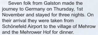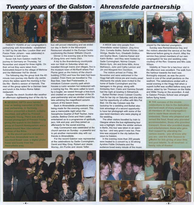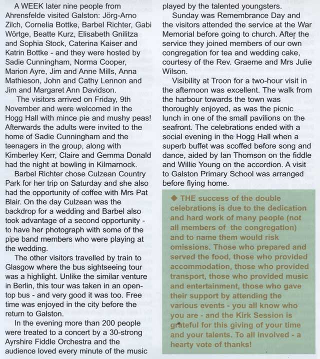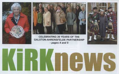 | Freunde der englischen Sprache finden nachfolgend die Original-Reportagen der Galstoner "Kirk News" über den Besuch in Ahrensfelde und den Gegenbesuch in Galston. |