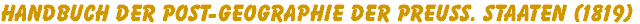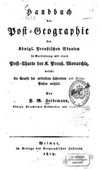 Das im August vorigen Jahres von mir angekündigte Handbuch der Post-Geographie der Königl. Preußischen Staaten, wird hiermit geliefert. Ich bin in Bearbeitung desselben meinem, in dessen Ankündigung dargelegten Plane durchaus treu geblieben, und schmeichle mir, daß man die Herausgabe dieses Handbuchs eben so nöthig, als nützlich finden wird, weil die Verwirrung der bisherigen Postangaben zu groß und zu nachtheilig war. Mit vieler Mühe habe ich aus Quellen gearbeitet, wie ich beweisen kann. ... Weißensee, im April 1919. F. W. Heidemann