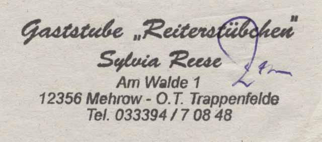 | Aber nehmen wir uns doch ersteinmal die Adresse vor: Mit der Ortsbezeichnung "Mehrow-Trappenfelde" ist schon mal klargestellt, daß sie zu denen gehört, die den Ortsteil Trappenfelde nicht so einfach unter den Tisch gekehrt haben wollen - schließlich ist es ja auch ihr Wohn- und Arbeitsort zugleich. |