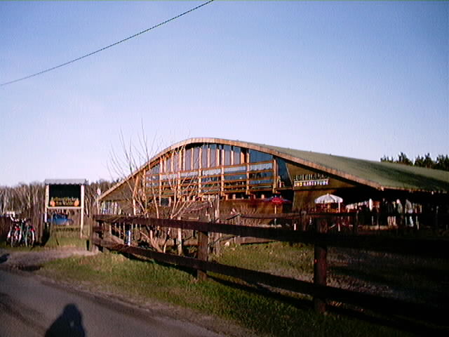 | Eine gleich große Fensterfront wie die nach draußen trennt die kleine Gaststätte von der Reithalle, überdacht von der gleichen aufregenden Balken-Konstruktion. Dort kann man bei einem gepflegten Bier, einem Kaffee oder einem kleinen Imbiß im Warmen und Trocknen sitzen und wahlweise den Blick nach draußen oder in die Halle zu den Reitern schweifen lassen. |