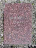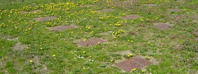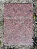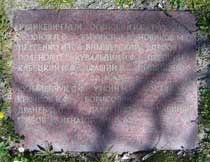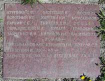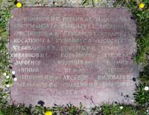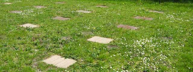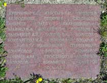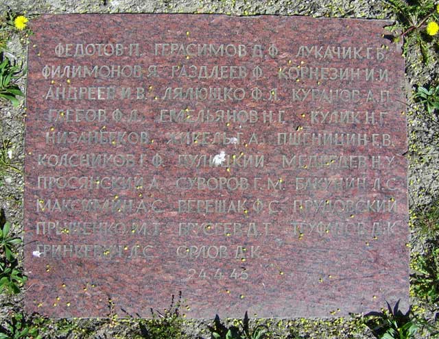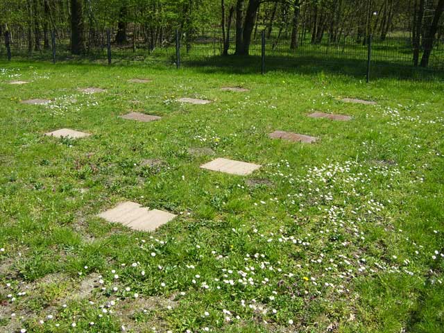 | Links und rechts vom Denkmal mit dem eine Fahne tragenden Soldaten befindet sich je ein Gräberfeld. In der hintersten Reihe sind größere Platten (links drei, rechts zwei) in die Erde eingelassen, auf denen mehrere Namen vermerkt sind. Davor markieren mehrere Reihen akkurat angeordneter Steinplatten 16 weitere Grabstellen auf jeder Seite. Nachfolgende Dokumentation der Gräber zeigt zunächst die linke und dann die rechts Seite - jeweils (hinten beginnend) reihenweise von links nach rechts. |