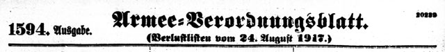 Achtung! Die nachfolgend den Datumsangaben hinterlegten Links führen auf eine Web-Seite des Vereins für Computergenealogie e.V., die sowohl den jeweiligen Ausschnitt der Verlustliste des genannten Datums, als auch die die im Rahmen eines Projektes ausgelesenen und abgespeicherten Daten des Soldaten enthält. Jene Seite unterliegt nicht unserer redaktionellen Verantwortung. Die dort weiter führenden Links konnten von uns nicht umfassend gesichtet werden, weshalb wir uns vorsorglich von deren Inhalt distanzieren.