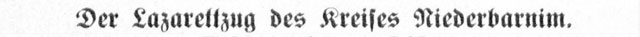 ... In erhöhtem Maße hat sich die Liebe und Sorge denjenigen zugewandt, die für des Vaterslandes Ehre ihr Blut vergossen haben und mit Wunden und Schmerzen die Schlachtfelder verlassen. Man hat daher neben den von der Heeresverwaltung bereitgestellten Lazarettzügen aus privaten und öffentlichen Mitteln sogenannte Vereins-Lazarettzüge geschaffen. Ein solcher Lazarettzug ist auch vom Kreise Niederbarnim eingerichtet und am 7. März 1915 als „Vereins-Lazarettzug Q3 Kreis Niederbarnim“ von der Heeresverwaltung übernommen worden. Der Lazarettzug führt mit Recht den Namen „Kreis Niederbarnim“. Wie groß das Interesse der Einwohnerschaft des Kreises an dem Lazarettzuge war, erhellt am besten daraus, daß auf die Anregung des Landrats hin nicht nur in ganz kurzer Zeit die erforderliche Anzahl von Betten gestiftet wurde, sondern auch zahlreiche Beiträge zur Deckung der übrigen Ausrüstungskosten gespendet wurden. Insgesamt sind auf diese Weise etwa 100000 Mark von den Kreiseinwohnern aufgebracht worden. ... Der Lazarettzug besteht aus 25 Mannschaftskrankenwagen, 1 Offizierskrankenwagen, 1 Wagen für den leitenden Arzt, 1 Wagen für die Assistenzärzte und Schwestern, 2 Mannschaftswagen, 1 Verbands- und Apothekenwagen, 1 Küchenwagen, 1 Vorratswagen, 1 Magazinwagen, 1 Gepäckwagen, 1 Güterwagen, 2 Heizkesselwagen. ... Jeder Mannschaftswagen hat 10 Betten, so daß in einem Zuge 250 verwundete Mannschaften transportiert werden können. ... Auf mehr als 150 Fahrten nach Osten und nach Westen hat der Lazarettzug bisher seine Aufgabe erfüllen und unseren Kriegern ein sichtbares Zeichen der Liebe und Dankbarkeit des Heimat werden können. |
