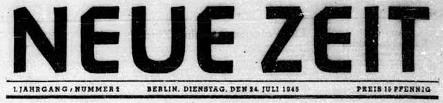 NEUE ZEIT 1. Jahrgang, Nr. 1 / Berlin, Sonntag, den 22. Juli 1945 / Preis 15 Pfennig Unsere Zeitung Neue Zeit Trotz der verzehrenden Sorge um Land und Volk geben wir unserem Blatt getrost einen Namen. Wir tun es vertrauenden Herzens. Trotz allem, was wir erlebten und erleben, sind wir überzeugt: der neue Aufbau wird sich vollziehen im Gange einer neuen Zeit. ... |
