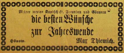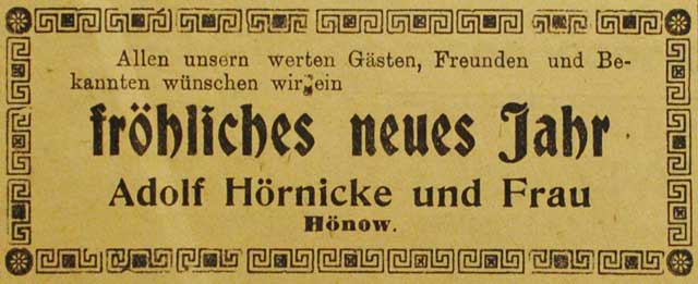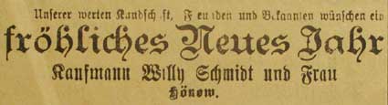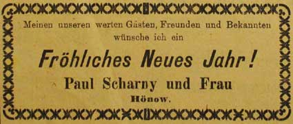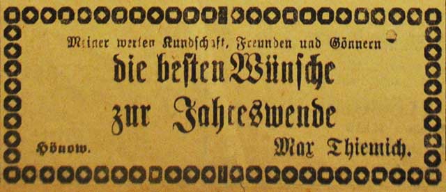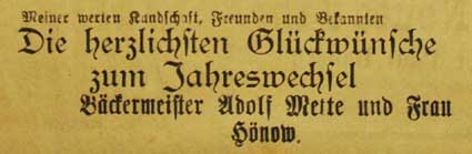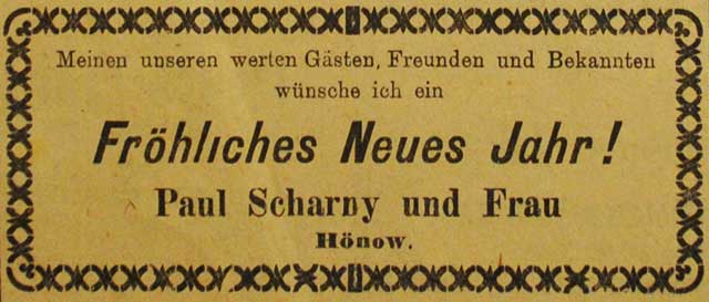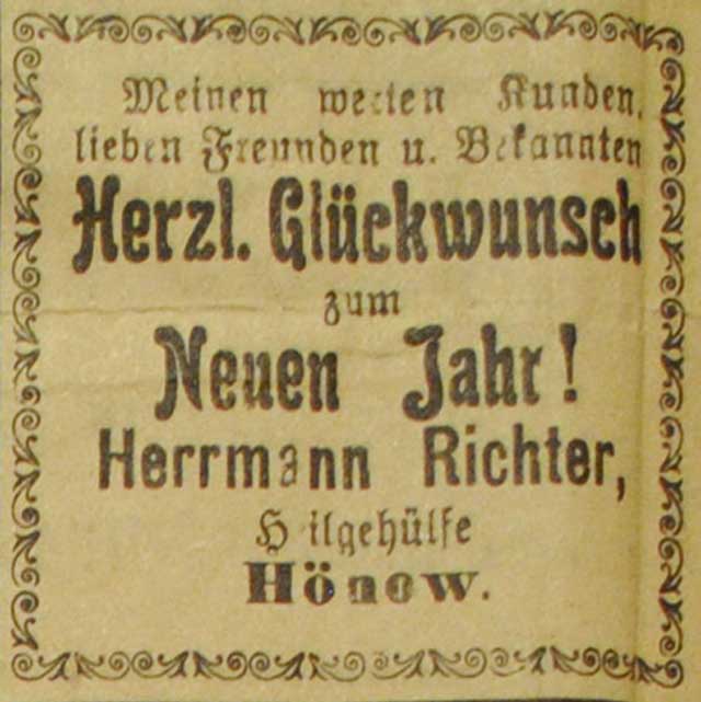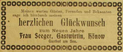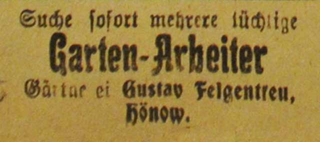 Die Weihnachtsfeiertage sind vorüber. Schön waren sie nicht. Regen und Wind, Kälte und Schneeschauer, so bleiben sie uns als die letzten Feiertage des Jahres 1913 in Erinnerung, das selbst an Enttäuschungen und Mißerfolgen im geschäftlichen Leben reich war. Hoffen und wünschen wir, daß 1914 sich besser gestaltet. Die Kandidaten des 9. Wahlbezirks bei den Wahlen zum Ausschuß der Ortskrankenkasse sind: Arbeitgeber: Vorschlagsliste I. 1. Semner, Richard, Bürgermeister Altlandsberg 2. Krüger, Paul, Gärtnereibesitzer, Altlandsberg 3. Braedikow, Franz, Brauereibesitzer, Altlandsberg. Vertreter des Wahlvorschlages: Bürgermeister Semner in Altlandsberg. Vorschlagsliste II. 1. Gilardone, Franz, Administrator, Neuenhagen, 2. Dotti, Fritz, Gutsbesitzer, Hönow, 3. Dannenfelzer, Albert, Gutsbesitzer, Marzahn Vertreter des Wahlvorschlages: Amtsvorsteher Buchholz in Ahrensfelde Arbeitnehmer: Vorschlagsliste I: (1-6) 4. Schmidt, Karl, Blumberg, in Arbeit bei Alb. Weidelt, Blumberg Vorschlagsliste II: (1-6) 1. Wollgramm, Herm., Brenner, Hönow, in Arbeit b. Dotti 3. Paul, Ernst, Forstarbeiter, Blumberg, in Arbeit bei Graf Arnim, Blumberg 4. Wegener, Gustav, Arbeiter, Ahrensfelde