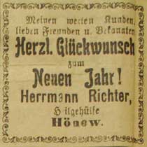 Werneuchen. In der letzten Stadtverordnetensitzung wurde die Anstellung eines Nachtwächters mit einem Gehalt von 1250 Mark beschlossen. Er hat auch die Straßenreinigung auszuführen. Die Anstellung eines zweiten Polizeisergeanten wurde vertagt, die Kosten dafür werden aber in den Haushalt eingestellt. Für den Bau einer Turnhalle werden 3000 Mark eingestellt. Hoppegarten. Am Sonntag fand im Saale des Logierhauses unter Leitung des Herrn Kuratus Siebner eine Weihnachtsfeier, verbunden mit Gesang, Deklamationen und Märchenspielen statt, bei der 80 katholischen Kindern durch Geschenke eine schöne Weihnachtsfreude bereitet werden konnte. |