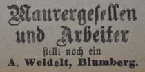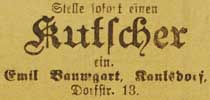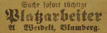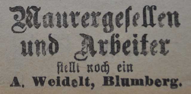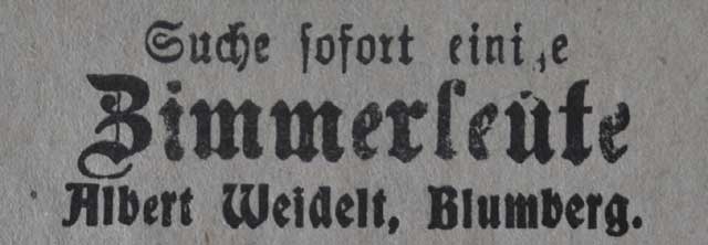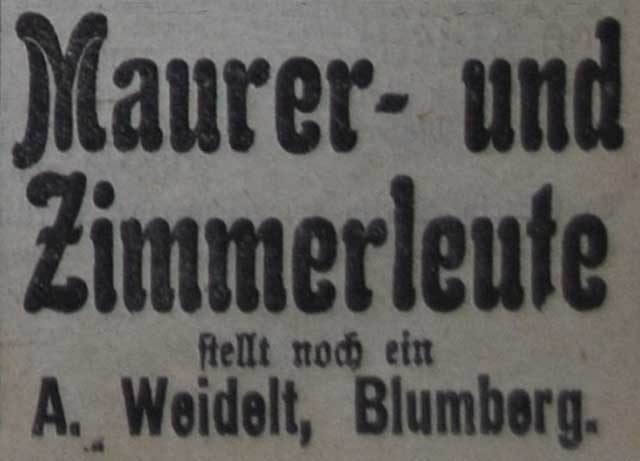 Seit voriger Woche brennt in Süd auf der Straße das elektrische Licht und der neue Dieselmotor befindet sich in Betrieb. Wir können also in diesen Tagen einen wesentlichen Fortschritt in unserer Stadt mit Freuden begrüßen. Kaulsdorf. Auf dem Hofe des Gutsbesitzers Voigt wurde der Berliner Arbeiter Papenfuß von einem Pferde derart durch Hufschläge verletzt, daß der Tod alsbald eintrat. Bekanntmachung. Zum 1. Januar 1914 ist auf dem Bahnhof Blumberg (Bez. Potsdam) 1 Lagerplatz ohne Gleisanschluß in Größe von 350 qm zu vermieten. Besichtigung des Platzes kann nach Meldung bei der 97. Bahnmeisterei Werneuchen oder dem Bahnhofsaufseher in Blumberg stattfinden. Miet- und Angebotsbedingungen liegen bei dem unterzeichneten Amt zur Einsicht aus; sie werden unentgeltlich abgegeben. Angebote sind versiegelt und mit Aufschrift „Mietsangebot auf Lagerplatz Blumberg“ bis zum 13. Dezember d. Js. vorm. 9 Uhr an das unterzeichnete Amt einzureichen. Berlin O. 17, im Dezember 1913. Fruchtstraße 12/13, Königliches Eisenbahnbetriebsamt 9 |