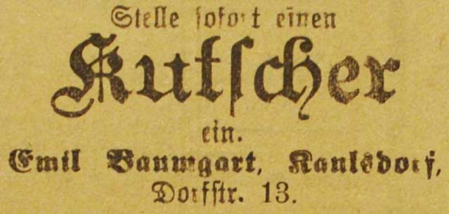Die wesentlichen Bestimmungen der Allgemeinen Ortskrankenkasse für den Kreis Nieder-Barnim, die bekanntlich sich auch über die Orte unseres Leserkreises erstreckt, sind folgende: Außer den bisherigen Versicherungspflichtigen treten u. a. hinzu Dienstboten, Lehrer und Erzieher, Hausgewerbetreibende, wenn sie nicht über 2500 Mark Jahresarbeitsverdienst haben (bisher 2000 Mark). ... Der Sitz der Kasse ist Berlin. ... Mahlsdorf. ... Eine lebhafte Aussprache rief die Beratung der Gemeinde Kaulsdorf hervor, ein engeres Zusammenarbeiten der Gemeinden Biesdorf, Kaulsdorf und Mahlsdorf einzuleiten. Der Gemeindevorsteher führte aus, daß die Frage der Vereinigung der drei Orte z. Z. nicht spruchreif ist, daß es sich auch nicht empfiehlt, einen Zweckverband zu bilden, sondern bei wichtigen Angelegenheiten gemeinsame Besprechungen vorzunehmen. ... |