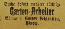 Hoppegarten. Ein eigner Rennbahnhof wird wie bekannt, in nächster Zeit in Angriff genommen werden. Die neuen Anlagen, die nach dem Muster der Grunewaldrennbahn gebaut werden, sollen dicht an die Rennbahn in die Nähe des Keßlerschen Grundstücks kommen. Ein alter Geizhalz. Seit einiger Zeit konnte man in der Arbeiterkolonie Bernau einen Mann beobachten, der unglaublich verlumpt umherging und hier und dort um Essen und Obdach bat. Wenn man ihm Beschäftigung zuwies, so zeigte er sich als ein stiller bescheidener Mensch, der gewissenhaft seine Arbeit verrichtete. Verschiedentlich suchte man ihn zu veranlassen, sich sauberer zu kleiden. Aber es war vergebens. Es fiel nun eines Tages auf, daß der Mann mit einem Berliner Bankhause eine lebhafte Korrespondenz unterhielt und als man nachforschte, stellte sich heraus, daß der seltsame Mann ein Vermögen von 200000 M. besaß, das ihm jährlich 9000 M. Zinsen einbrachte. Ein Bruder des „armen Reichen“ war Architekt. Doch all seinen Bemühungen ist es bisher mißlungen, den seltsamen Kauz in ein geordnetes Leben zurückzuführen. Man hat ihn nun gezwungen, die schuldige Steuer zu entrichten was er dann auch schließlich tat. Aber als man das unerhörte Ansinnen an ihn stellte, endlich die alten Lumpen abzulegen und sich mit anständiger Kleidung zu versehen, da hielt es ihn nicht mehr. Er verabschiedete sich von diesem ungastlichen Asyl und wanderte weiter. |