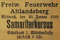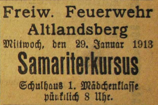 Schöffengerichtssitzung am 18. Novbr. 1913. ... Der Arbeiter Boederstedt hatte in Blumberg durch einige Hiebe eine Körperverletzung begangen. Die ganze Sache lag sehr mild, so daß der Gerichtshof 40 M. Geldstrafe für ausreichend ansah. Bekanntmachung. Die Liste der wählbaren Mitglieder zu den im Januar 1914 stattfindenden „Vorstands- und Repräsentanten-Wahlen“ der Synagogen_Gemeinde Altlandsberg liegt in der Zeit vom 1. bis 8. Dezember 1913 im hiesigen Rathause zur Einsicht aus. Einwendungen sind während dieser Zeit beim Vorstand zu erheben. Der Vorstand der Synagogen-Gemeinde Altlandsberg. I. A. L. Samuel.