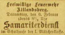 Am Tage der Hundertjahrfeier der Schlacht bei Leipzig, am Sonnabend dieser Woche, fällt in allen preußischen Schulen der Unterricht aus. Es soll am 18. Oktober in den Schulen eine der Bedeutung des Tages gerecht werdende Feier in würdigem Rahmen veranstaltet werden, deren Feststellung in den Einzelheiten den Leitern der Unterrichtsanstalten überlassen bleibt. Ueber unsere Stadt plaudert in dem Kreisblatt O. M: Von welcher Seite der Wanderer auch Altlandsberg betritt, überall bietet sich dem Auge ein gar freundliches Bild. Die Umgebung der „Berliner Mühle“ im Westen entbehrt nicht der Romantik, und das geschmackvolle neue Amtsgericht, sowie die Bauten in seiner nächsten Nähe überraschen durch ihre vornehmen Formen, und wer von Strausberg her dem Gebiet der Stadt sich nähert, wird von vornherein für den Ort eingenommen durch den poetischen Gruß, den die sagenumwobene Eiche am Kilometerstein 27,6 ihm zuwinkt: ... Aus dem Kreise. Am 1. Oktober d. Js. ist die bisherige Einkommensteuer-Veranlagungskommission in Berlin in die beiden Kommissionen Niederbarnim-West ... und Niederbarnim-Ost ... geteilt worden. ... Zum neuen Veranlagungsbezirk Niederbarnim-Ost gehören die Orte: Altlandsberg, Ahrensfelde, Biesdorf, ..., Blumberg, ..., Dahlwitz, ..., Eiche, ..., Hellersdorf, ..., Hönow, ..., Kaulsdorf, ..., Lindenberg, ..., Mahlsdorf, ..., Mehrow, ... Völkerschlachtsmünzen, voraussichtlich Drei- und Fünfmarkstücke, werden aus Anlaß der 100jährigen Wiederkehr der Schlacht bei Leipzig von der Dresdener Münze geprägt. Diese Denkmünzen kommen auch an alle Bundesstaaten zur Verteilung, was bei den gewöhnlichen Münzen, die das Bild der Herrscher von Bundesstaaten tragen, nicht zu erfolgen pflegt. |